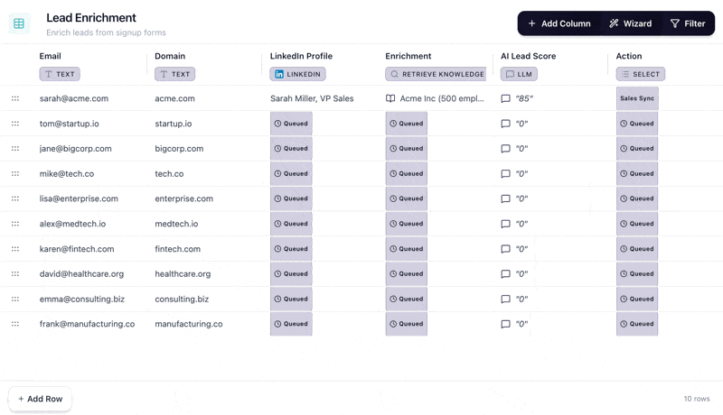 Use as your automation engine: connect CRM, support, billing, and internal tools; move and transform data between them; and orchestrate multi-step workflows in tables instead of node diagrams. If you are coming from tools like n8n, Zapier, or Make, you keep the same use cases - but every run becomes a visible, filterable row you can debug in seconds.